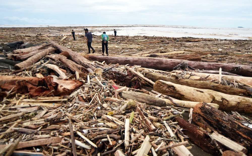 Kayu gelondongan sisa material banjir bandang menumpuk di Pantai Air Tawar, Padang, Sumatra Barat. (FOTO : ANTARA)